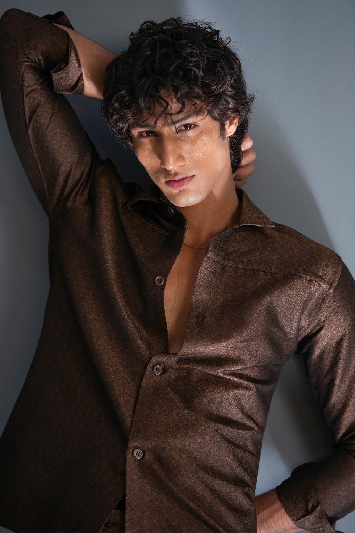 Experience understated luxury with the cinnamon glow co-ord set. This cord set is defined by its deep, warm brown hue with subtle hints of bronze or copper, woven into a fine, all-over pattern a jacquard or small geometric weave. The shirt boasts a clean, classic silhouette with color-matched buttons, allowing the fabric's exquisite texture to take center stage. Paired with perfectly tailored trousers, this set delivers a rich, unified monochromatic look that is perfect for evening gatherings, sophisticated dining, or making a refined style statement.