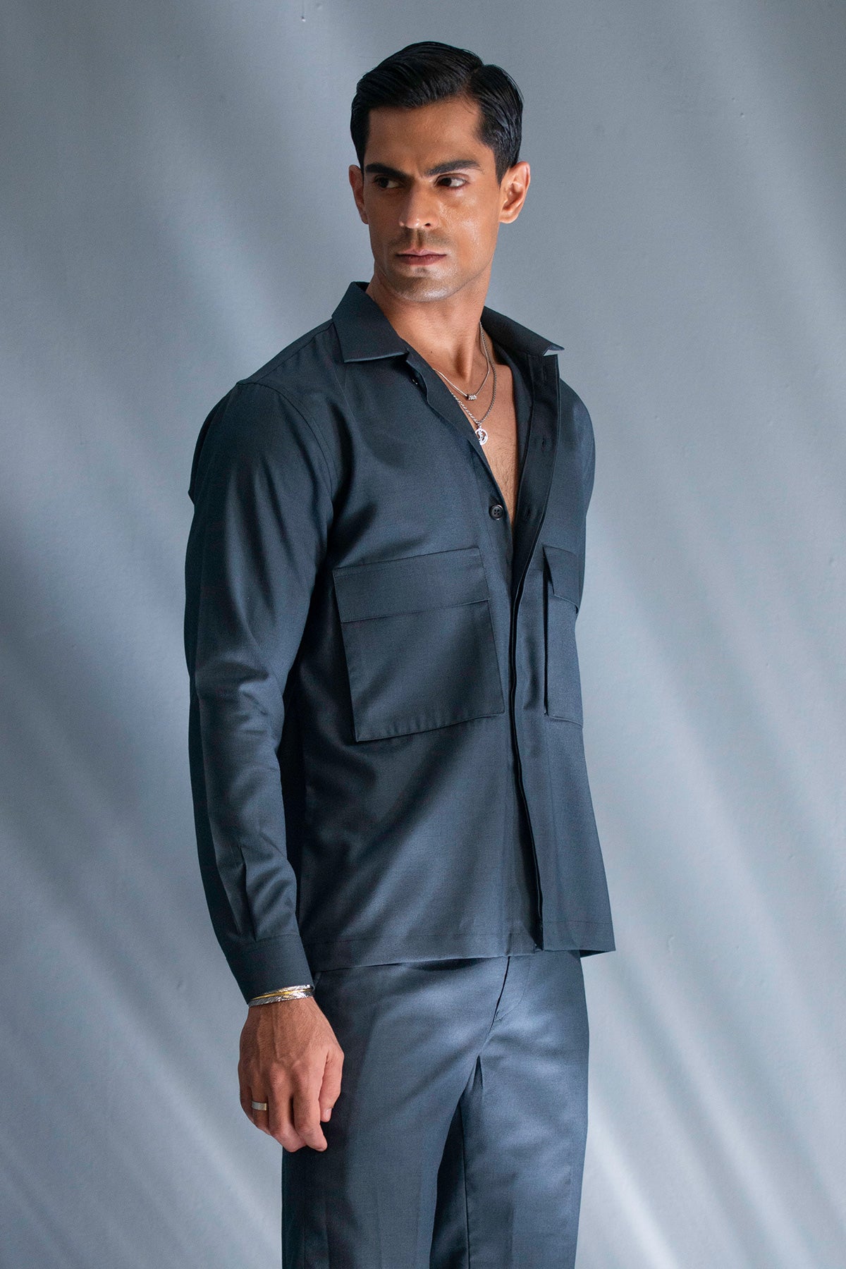 Achieve polished simplicity with the The Dark blue Patch Pocket Cord Set .This two-piece set offers a contemporary take on classic tailoring with a relaxed, yet structured fit. The overshirt-style top is defined by its bold, symmetrical patch pockets on the chest, lending a functional, utility-inspired edge. Crafted in a rich, deep charcoal or slate grey, this monochromatic set is an effortless solution for a modern, put-together look, whether worn together or styled as separates.