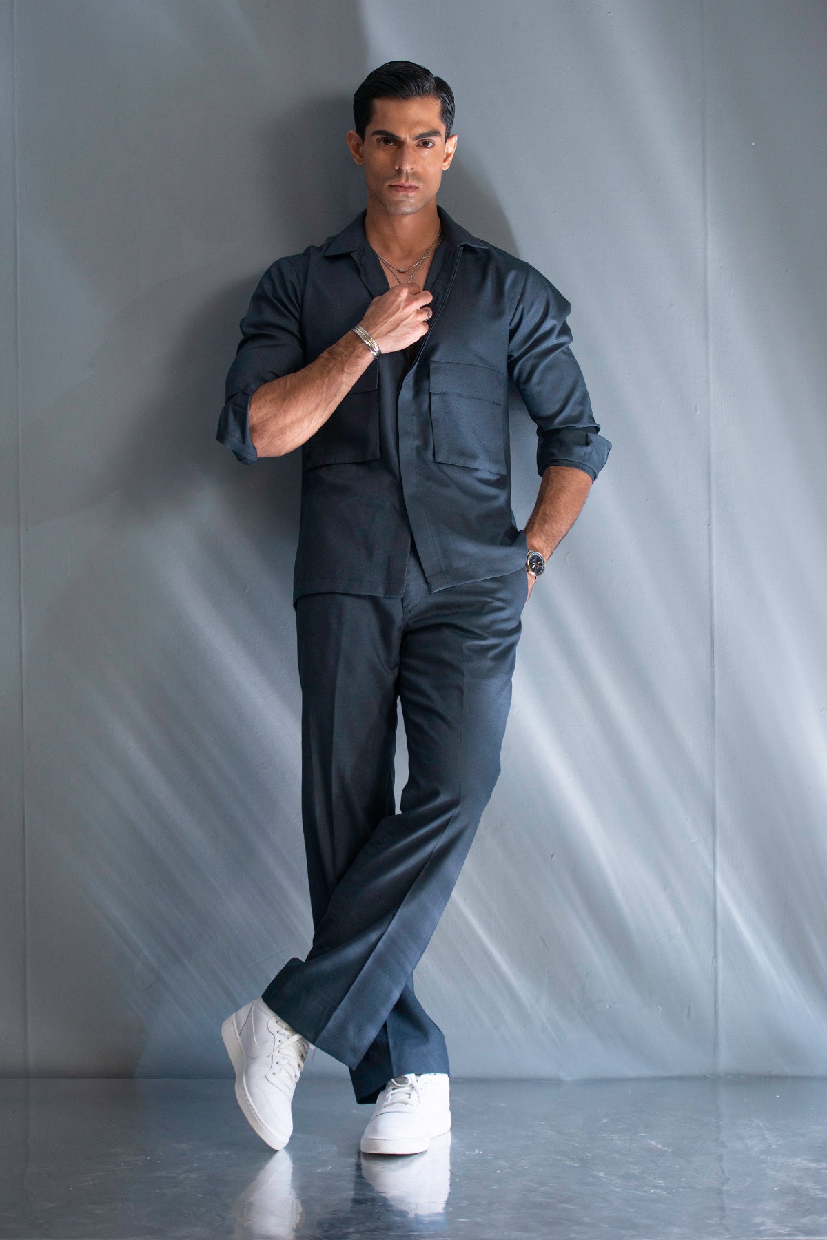 Accessories: A simple silver chain and a watch are the perfect accents, keeping the focus on the structured lines of the outfit.