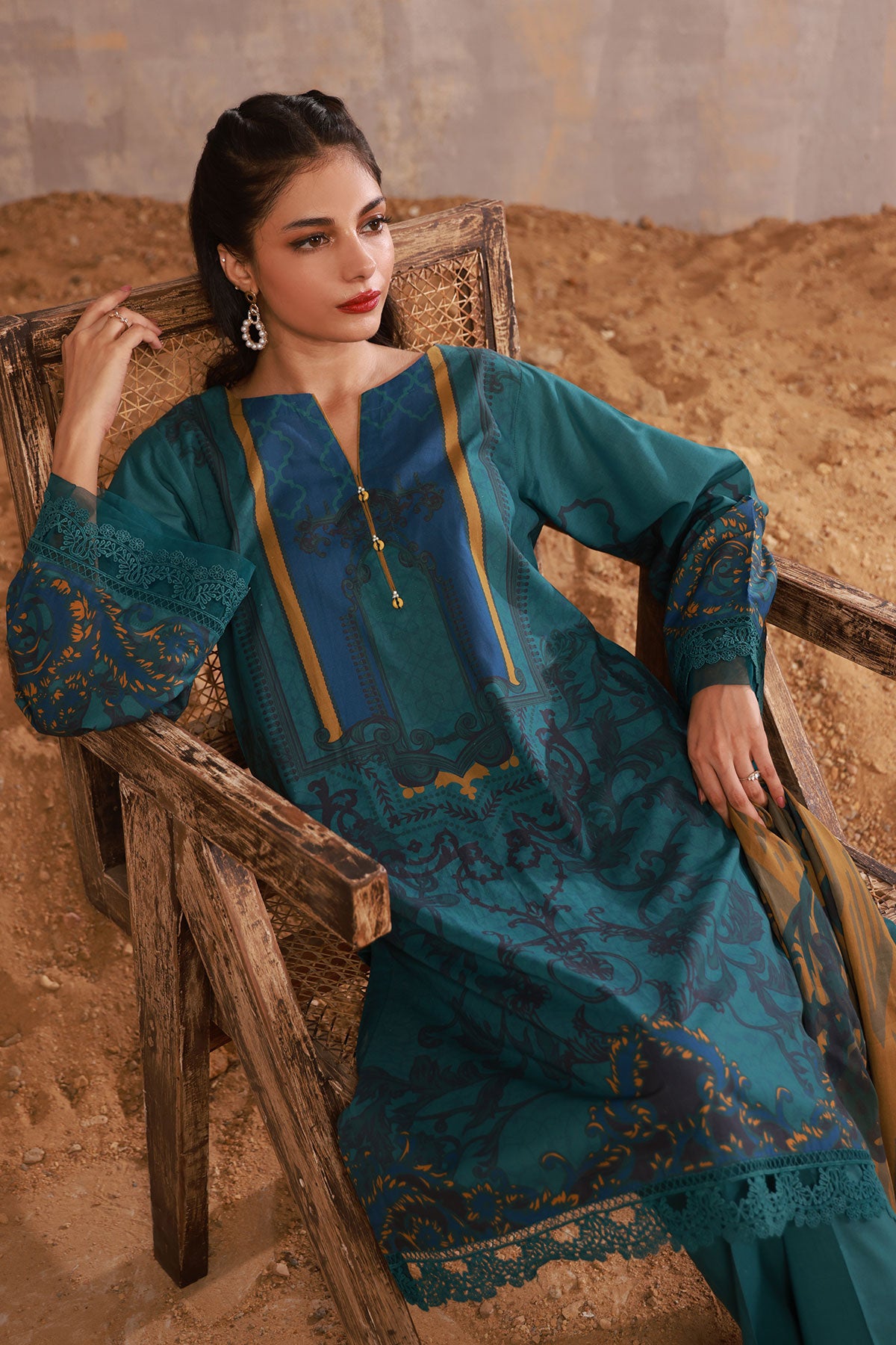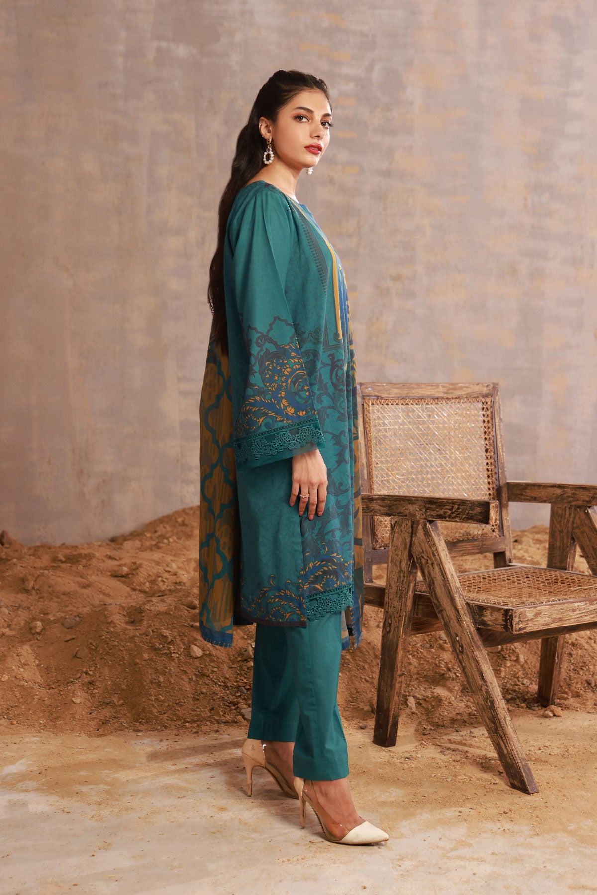 3PC TEAL COLOR CAMBRIC SHIRT DYED TROUSER DYED ORGANZA WITH LACES PRINTED DUPATTA