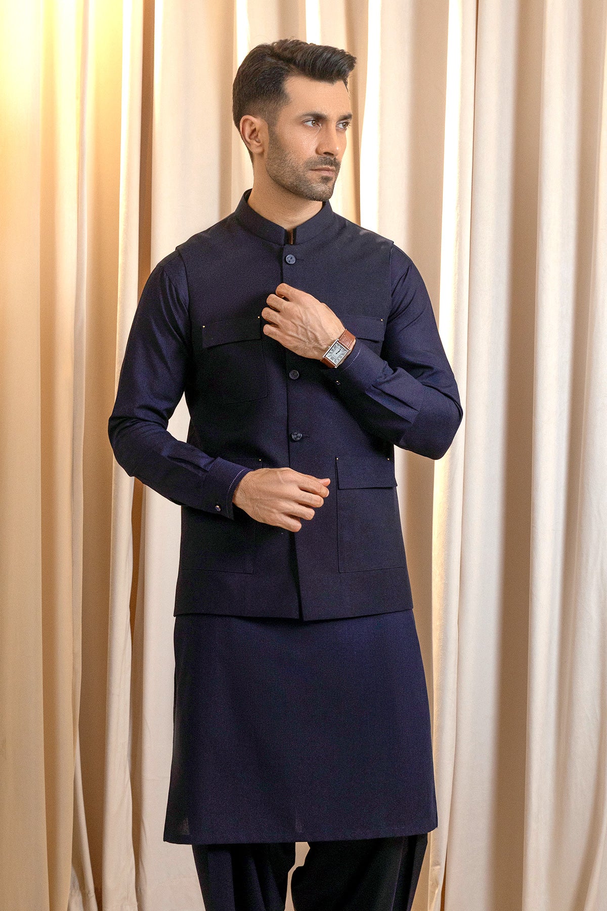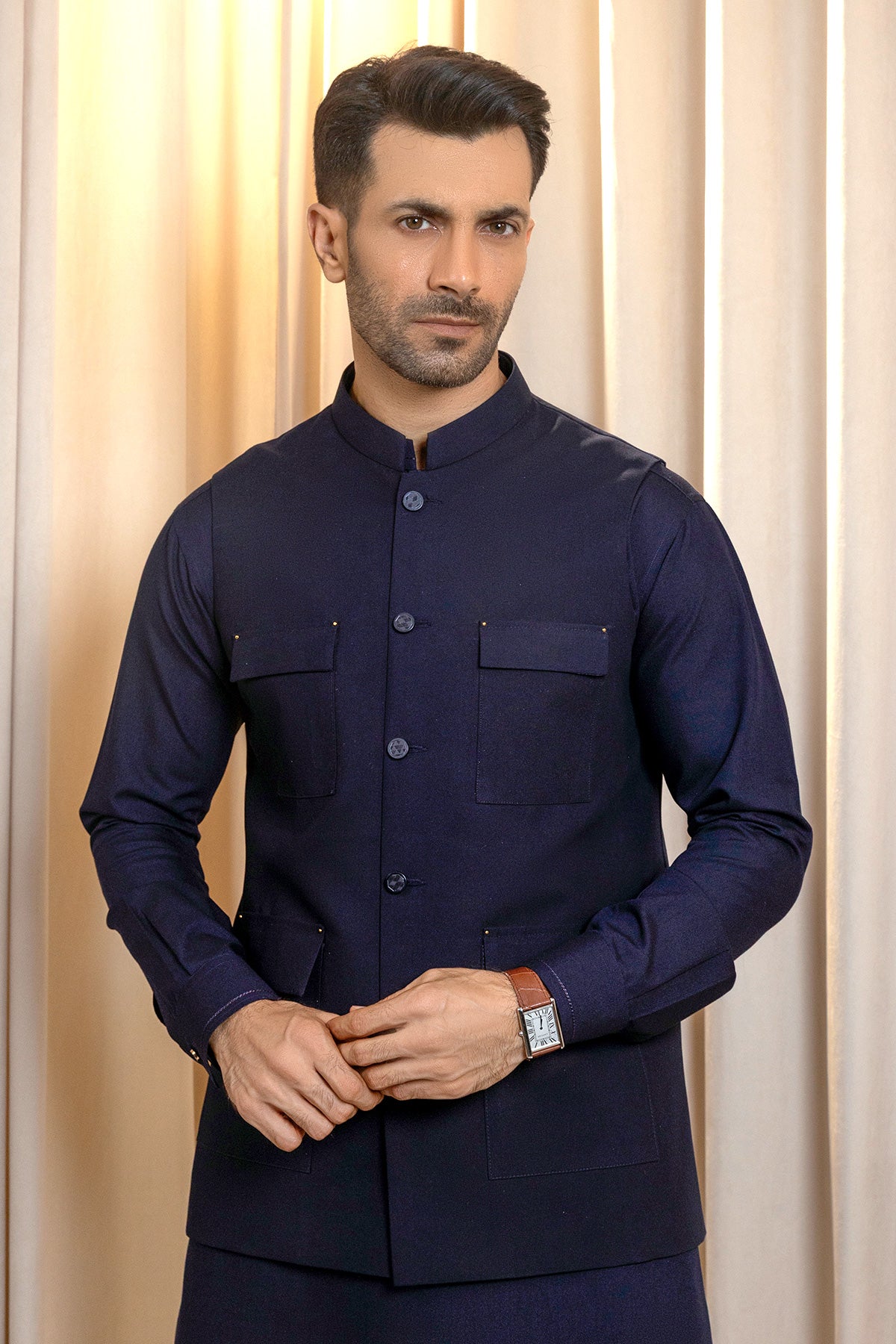 Men’s Deep Blue Waistcoat, styled with sleek black